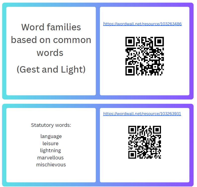 There are 15 words to learn to spell per week with a test on 10 of these each Friday. 10 of the words will follow the spelling rule learnt in school that week and 5 are from the statutory government list of words for Year 5 & 6. The lists for the whole year are available at the bottom of the page. At the children's request, I am now making an OPTIONAL blooket per week as another way of practising the spellings and learning their meanings. The QR codes / weblinks to these are further up this page.