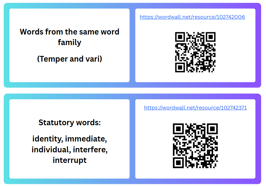There are 15 words to learn to spell per week with a test on 10 of these each Friday. 10 of the words will follow the spelling rule learnt in school that week and 5 are from the statutory government list of words for Year 5 & 6. The lists for the whole year are available at the bottom of the page. At the children's request, I am now making an OPTIONAL blooket per week as another way of practising the spellings and learning their meanings. The QR codes / weblinks to these are further up this page.